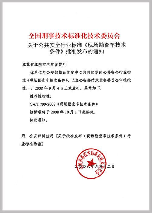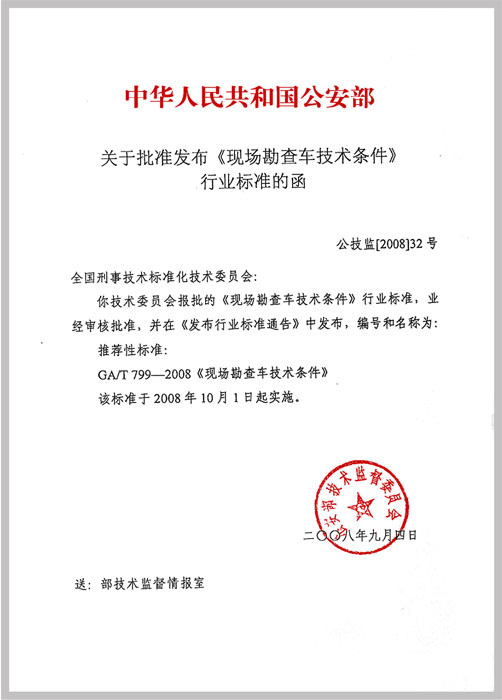 由我單位與公安部物證鑒定中心共同起草的公共安全行業標準《現場勘查車技術條件》,已經公安部技術監督委員會審核批準,于2008年10月1日起實施。